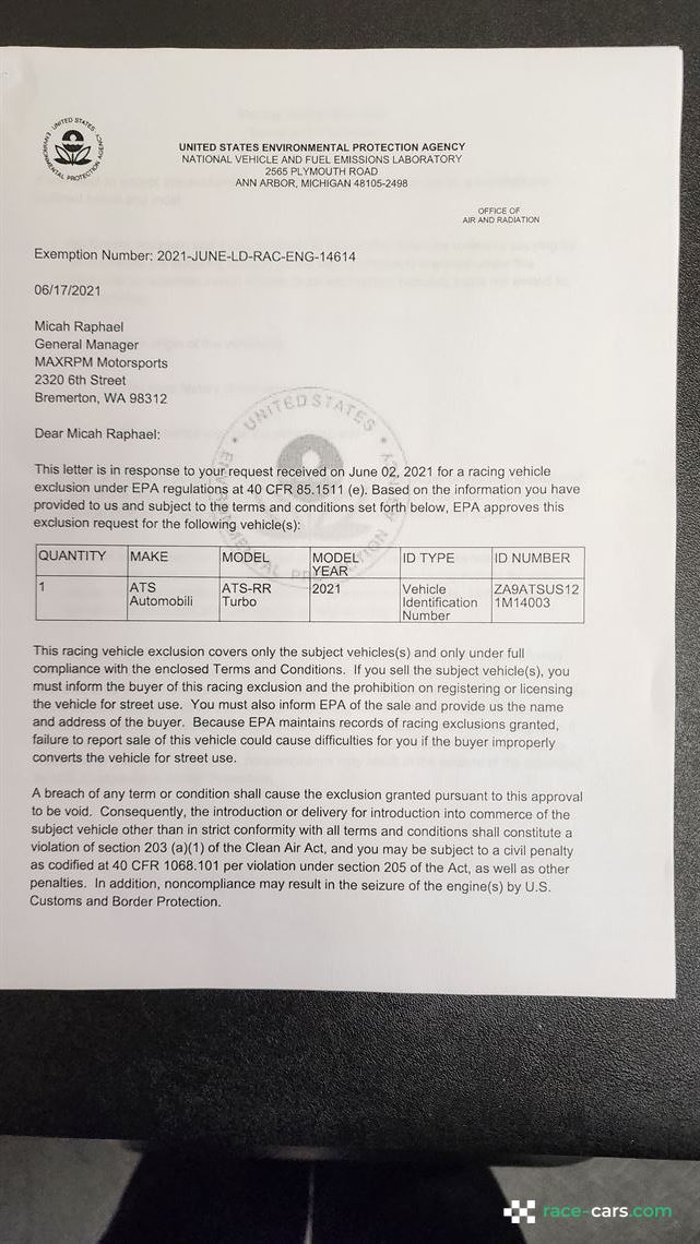 2021 ATS-RR Turbo Carbino Racecar for sale, costing just over $175,000.00 US dollars before international shipping.. This is car number 3 from ATS-Corsa in Italy. This car was imported at the cost of $34,000.00 US dollars into the United States with an official EPA exemption so it is fully legal to operate in Closed Course events in the United States. (all documents included). Not road/street legal but a true monster on the track and not for the faint of heart. So many specifications to relay here. Please follow the link provided for a complete breakdown on the cars specifications;