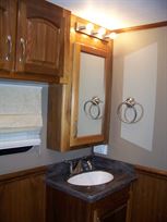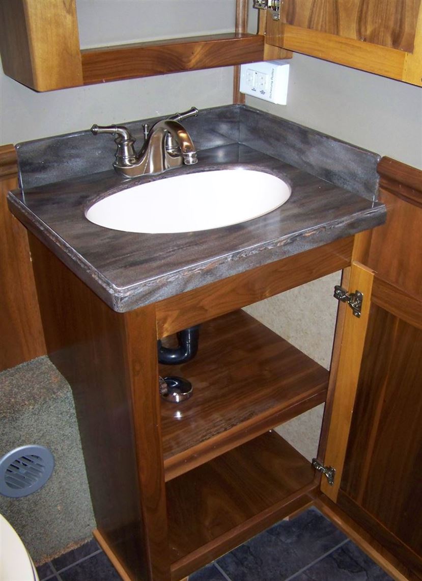 - Tiled Living Area: Sofa, 40" LED TV, Small Refrigerator, Overhead Walnut Wood Cabinets, 60" Extended Bunk Over Cab, Padded walls & Ceiling