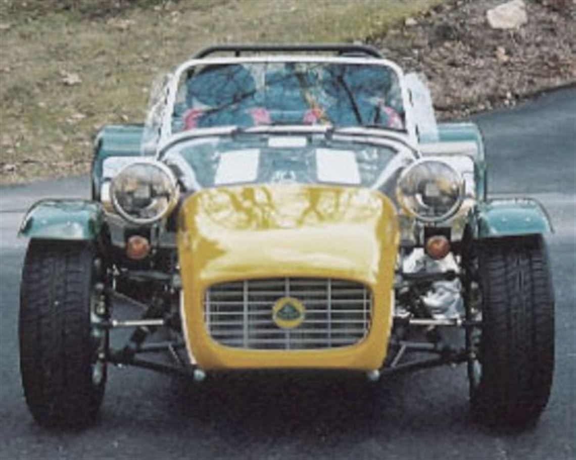2001 Caterham Super Seven Classic SE Limited Edition, registered as 1973 Lotus Caterham 7, Polished Aluminum Body, Yellow Nose, British Racing Green Cycle Wings and Fenders, Black Dash & Interior Side Panels, Black Nylon Carpets, Cloth Adjustable Seats, Red Four-Point Harnesses, Suede Momo Steering Wheel, Cycle Front Wings, Side-Exit Stainless Steel Competition Exhaust w/Jet Hot Coating, Competition Headers w/Jet Hot Coating, 6 x 13 Minator Alloy Wheels, Increased Visibility Weather Equipment (roof & doors), 1700cc Ford Crossflow HP (150bhp / 128lbs/ft) w/roller rockers and hot cam shaft, and 5-Speed Trans all built by Caterham USA, Professionally assembled by George Alderman’s Mid-Atlantic Caterham, Less than 900 miles on car in perfect condition, very fast street legal race car.