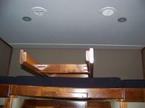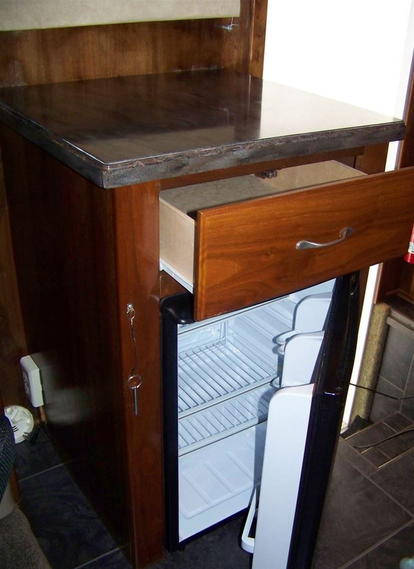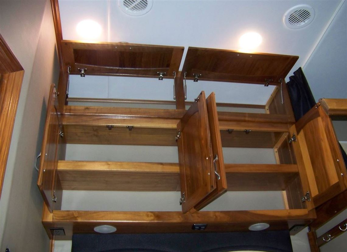 - Tiled Living Area: Sofa, 40" LED TV, Small Refrigerator, Overhead Walnut Wood Cabinets, 60" Extended Bunk Over Cab, Padded walls & Ceiling